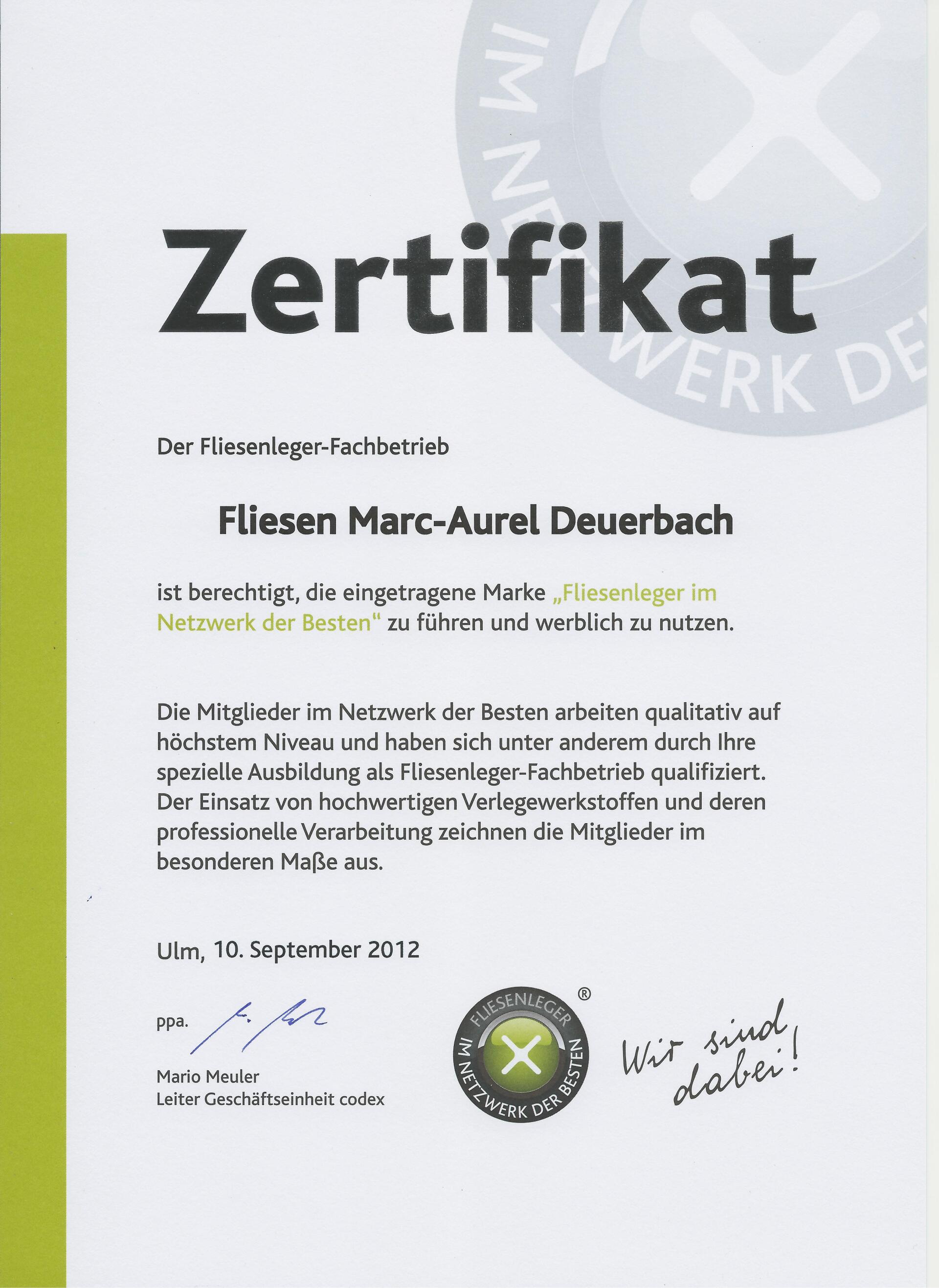 FLIESEN MARC-AUREL DEUERBACH, wurde 1999, nach erfolgreichem Abschluß der Meisterprüfung im Fliesen-, Platten- und